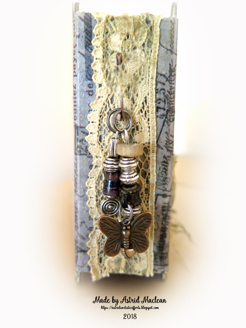 Now for the spine: To cover the rings, I simply added some additional design tape and lace over the rings on the outside, made a couple of little charms to add and that was pretty much it.
